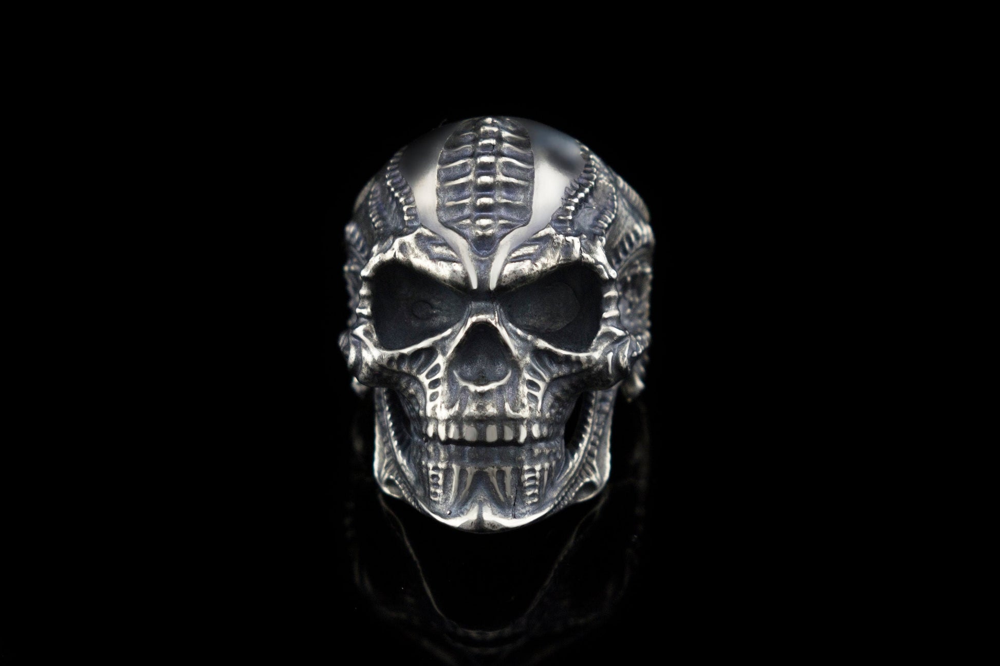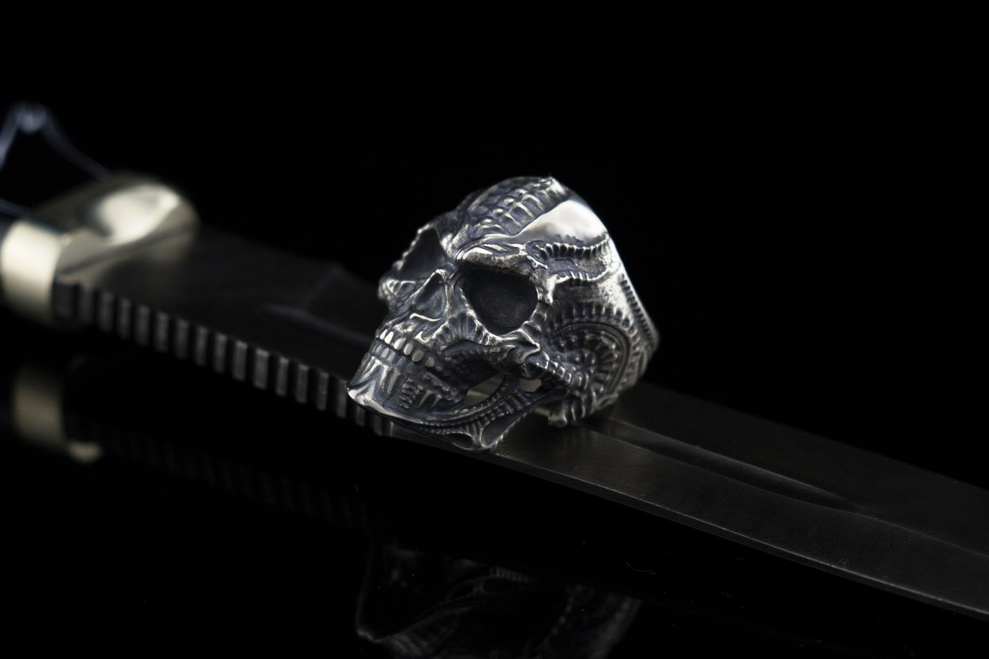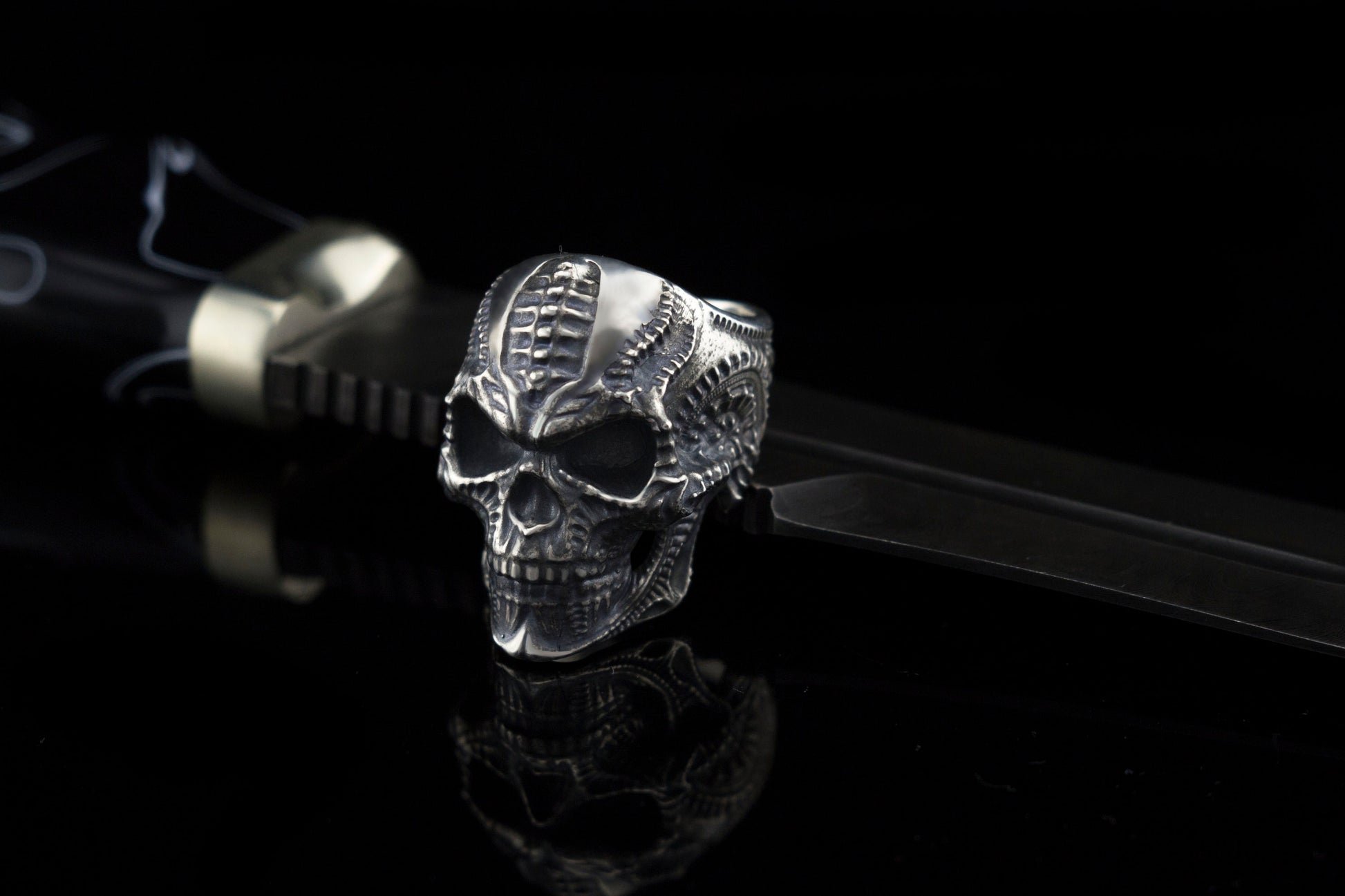 Silver skull ring Biker jewelry Biomechanical skull ring Silver gift for biker Brutalist jewelry