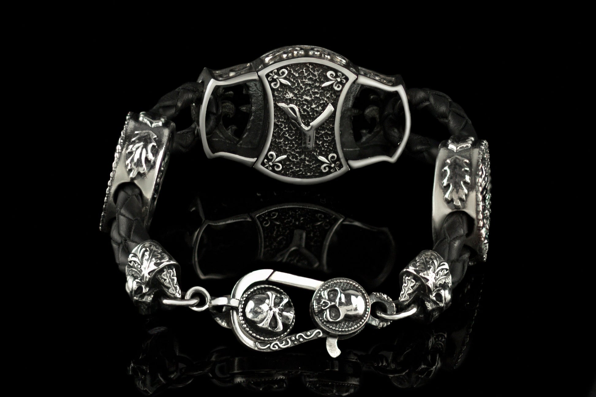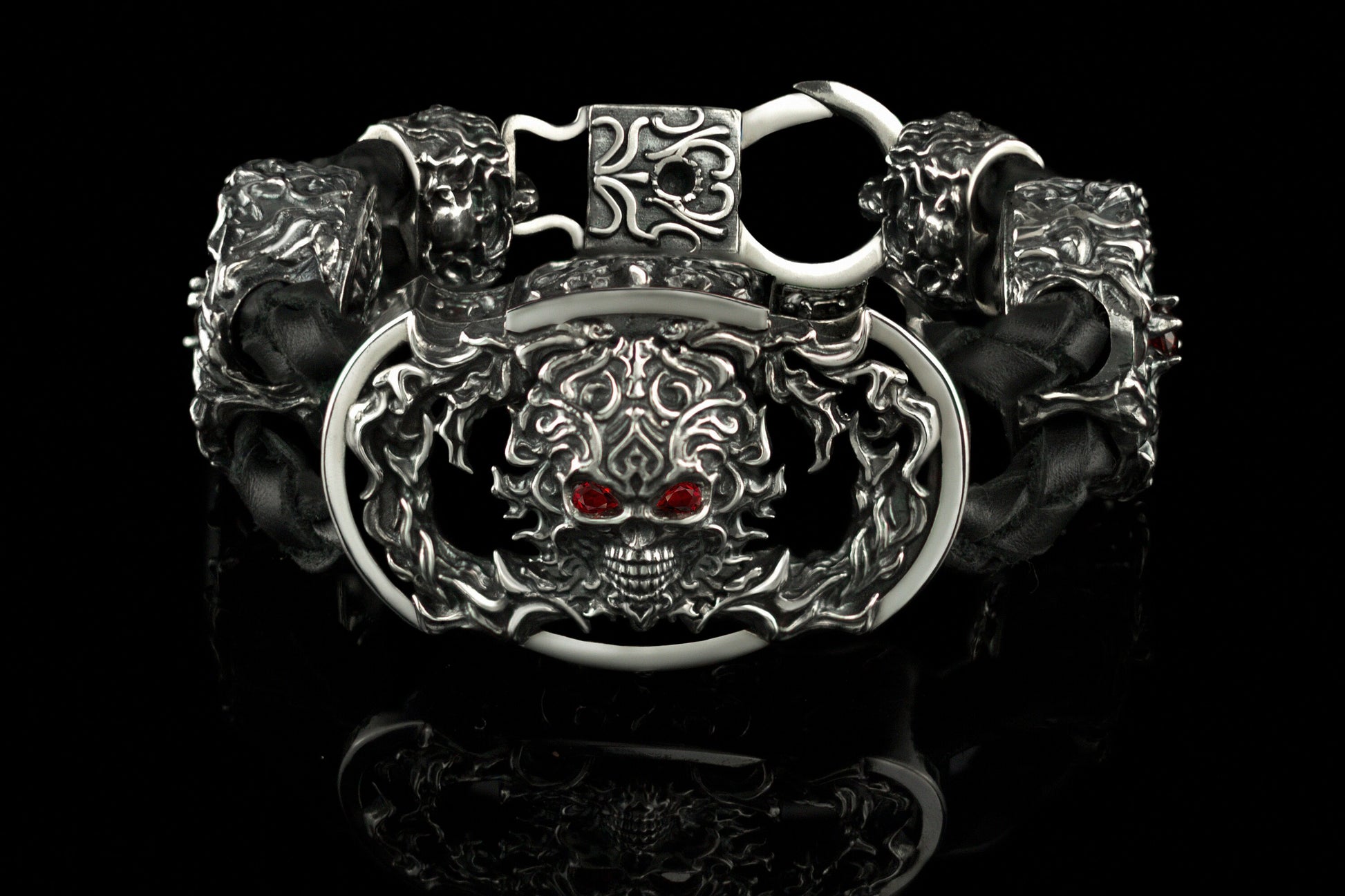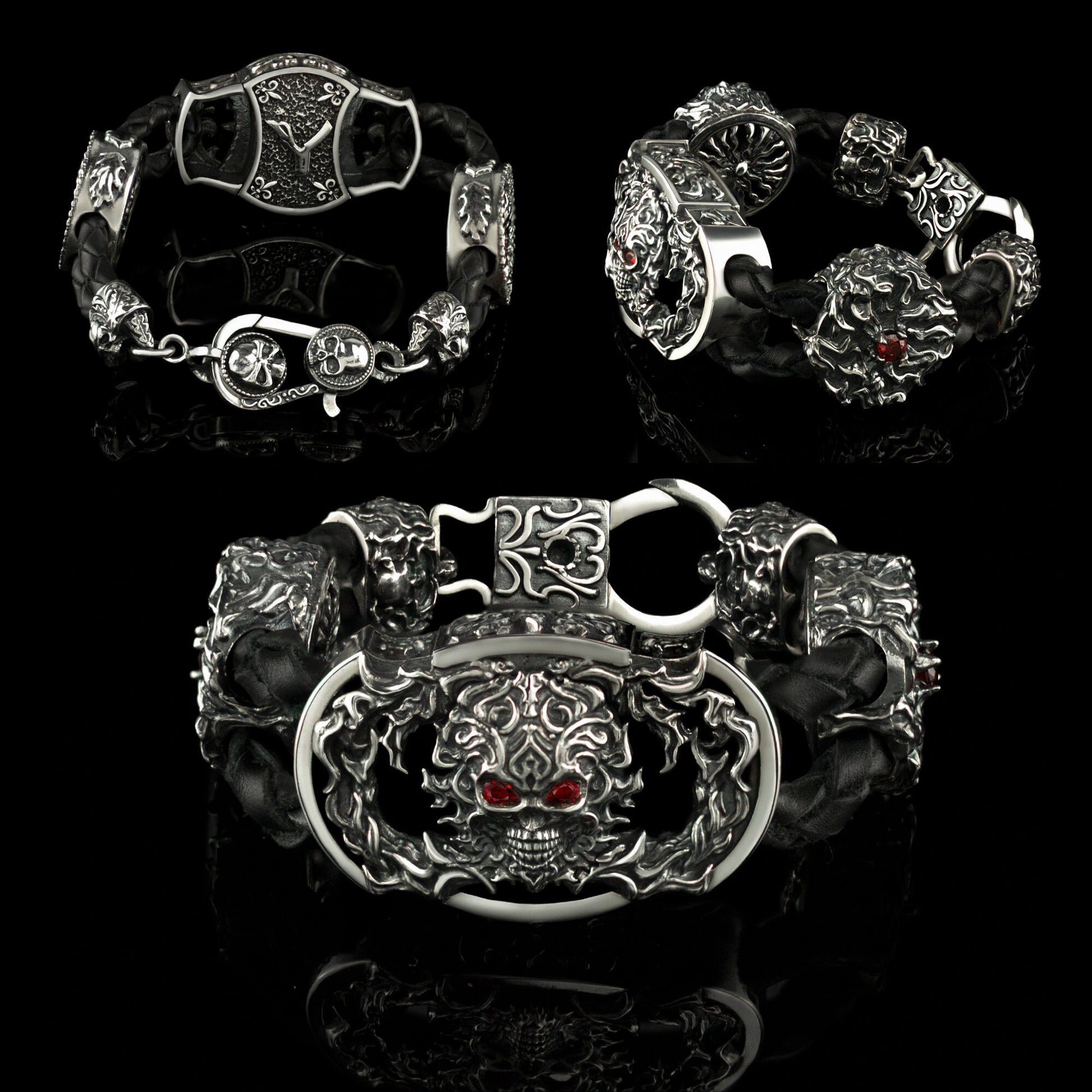 Men's bracelet Silver bracelet Leather bracelet Skull bracelet Brutalist jewelry Skull Motorcycle Leather Bracelet