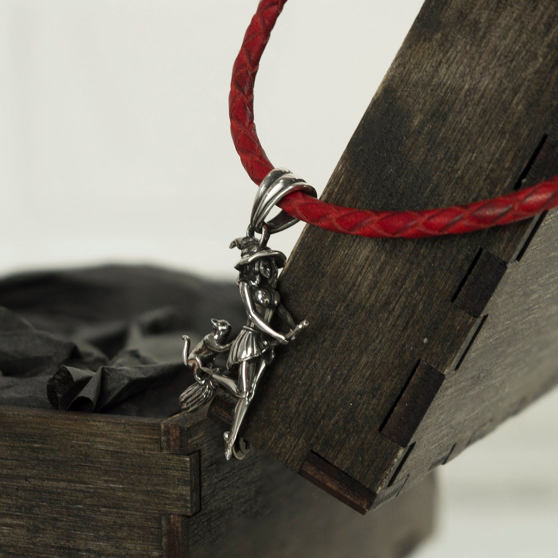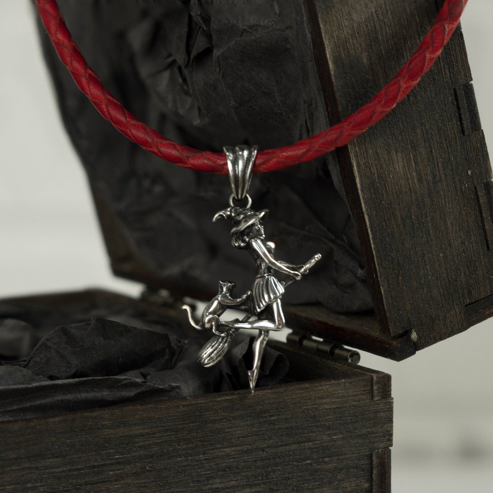 Flying witch with cat pendant with red leather necklace Silver witch on a Broomstick Witches jewelry