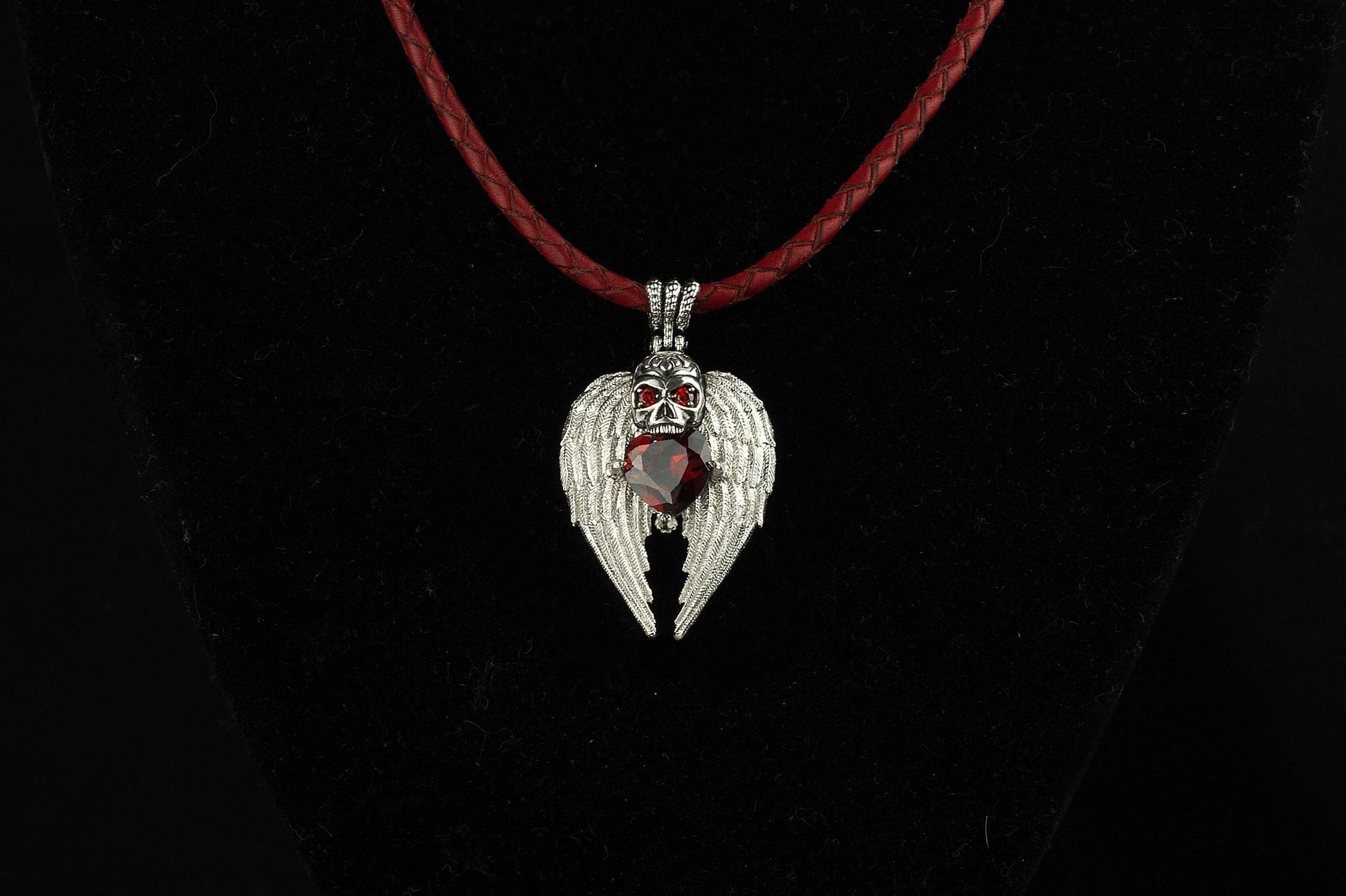 Sillver skull pendant skull jewelry red gemstone heart Gothic