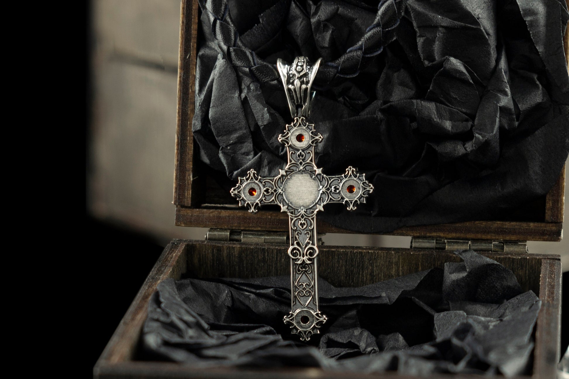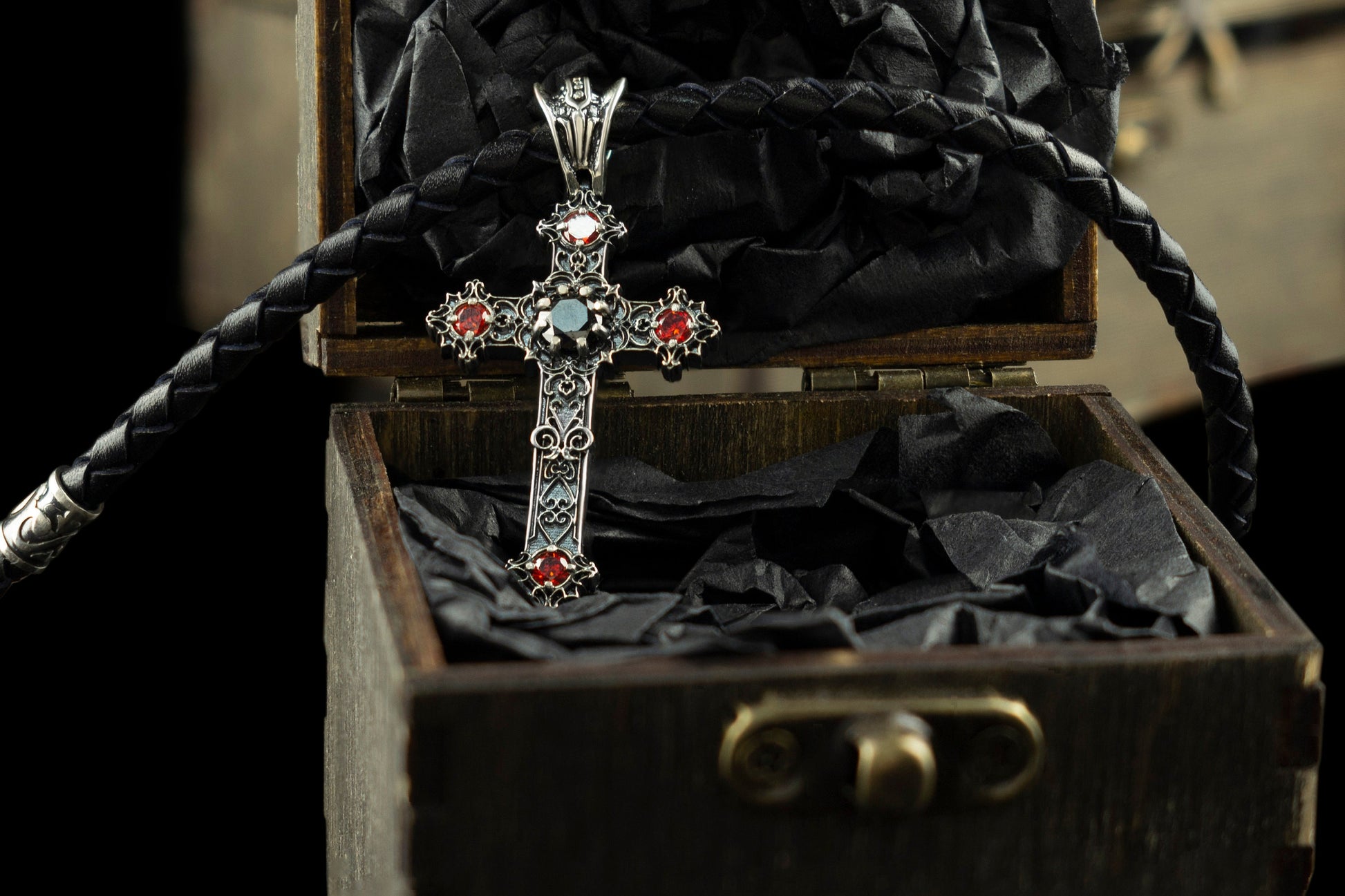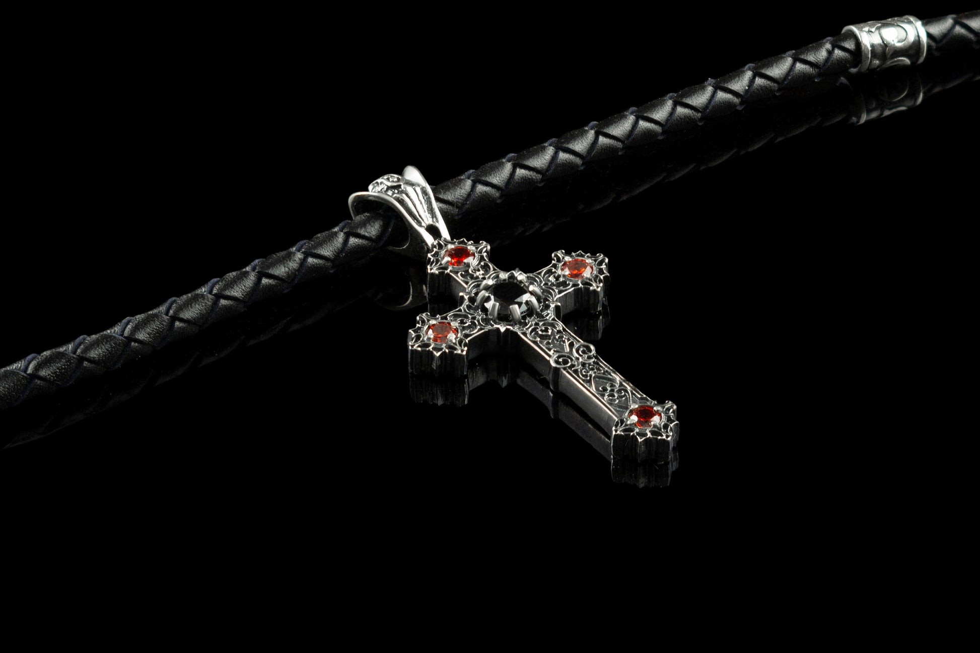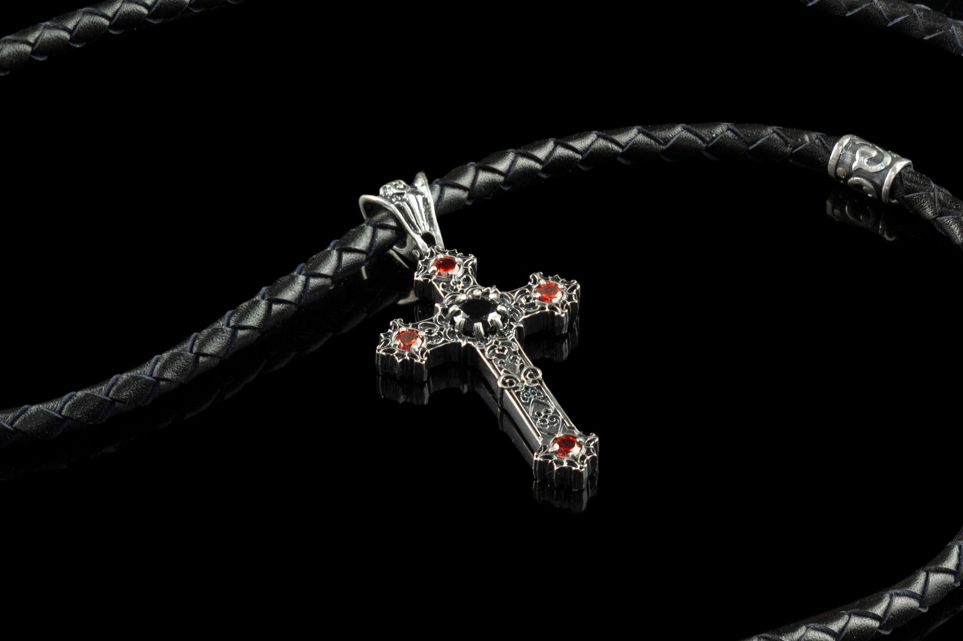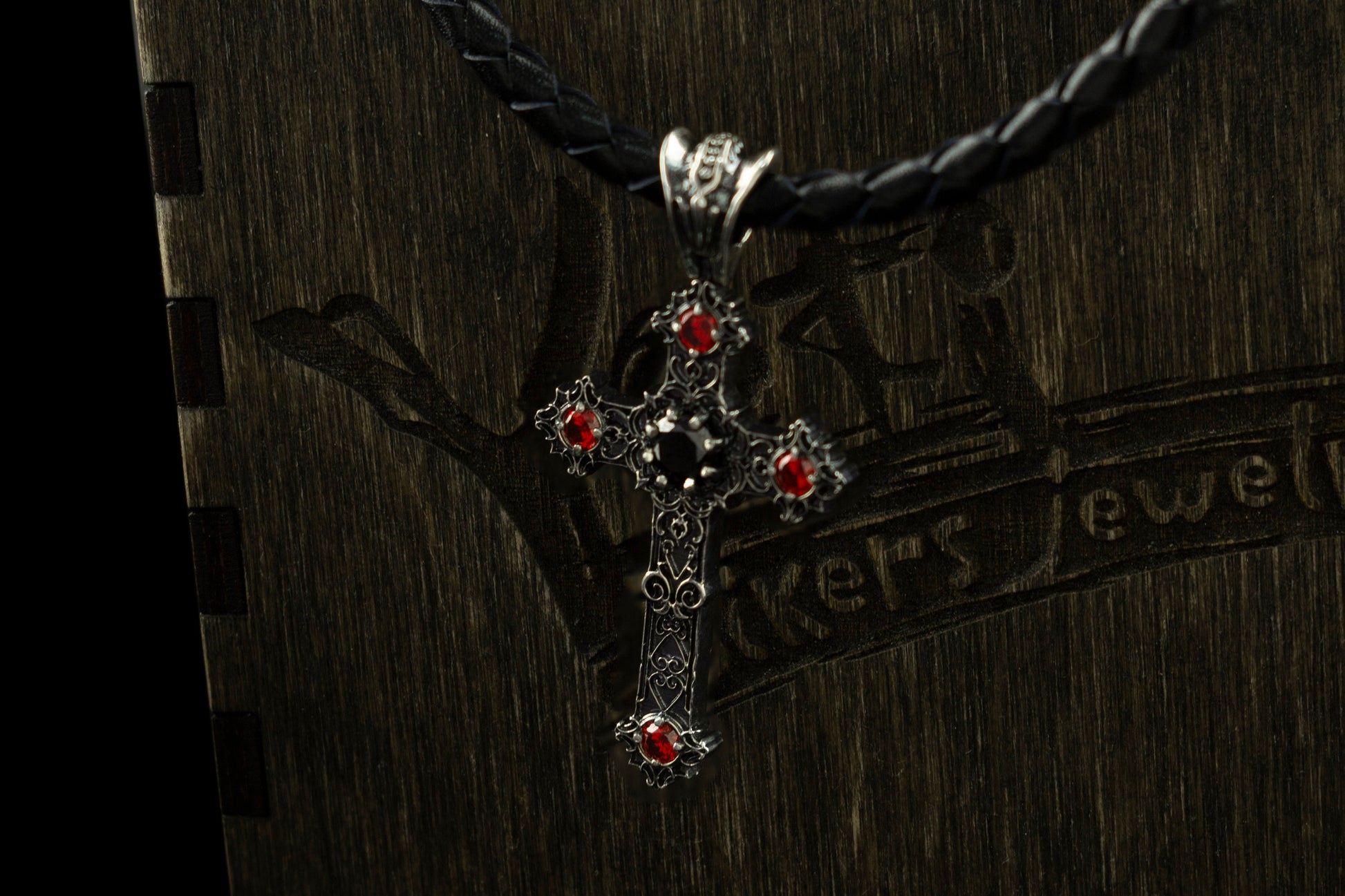 Gothic сross Silver cross necklace Cross with leather cord Black and red