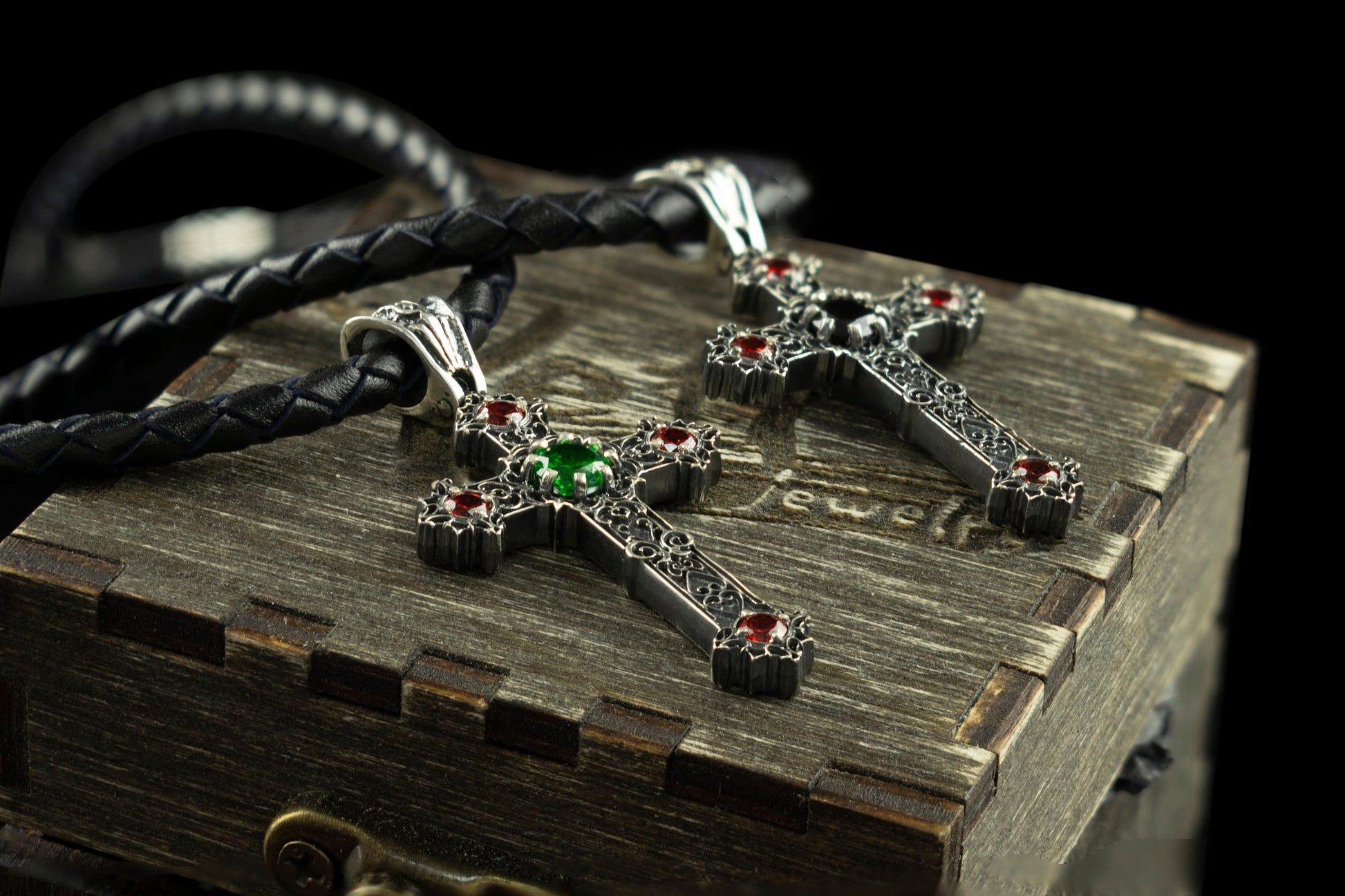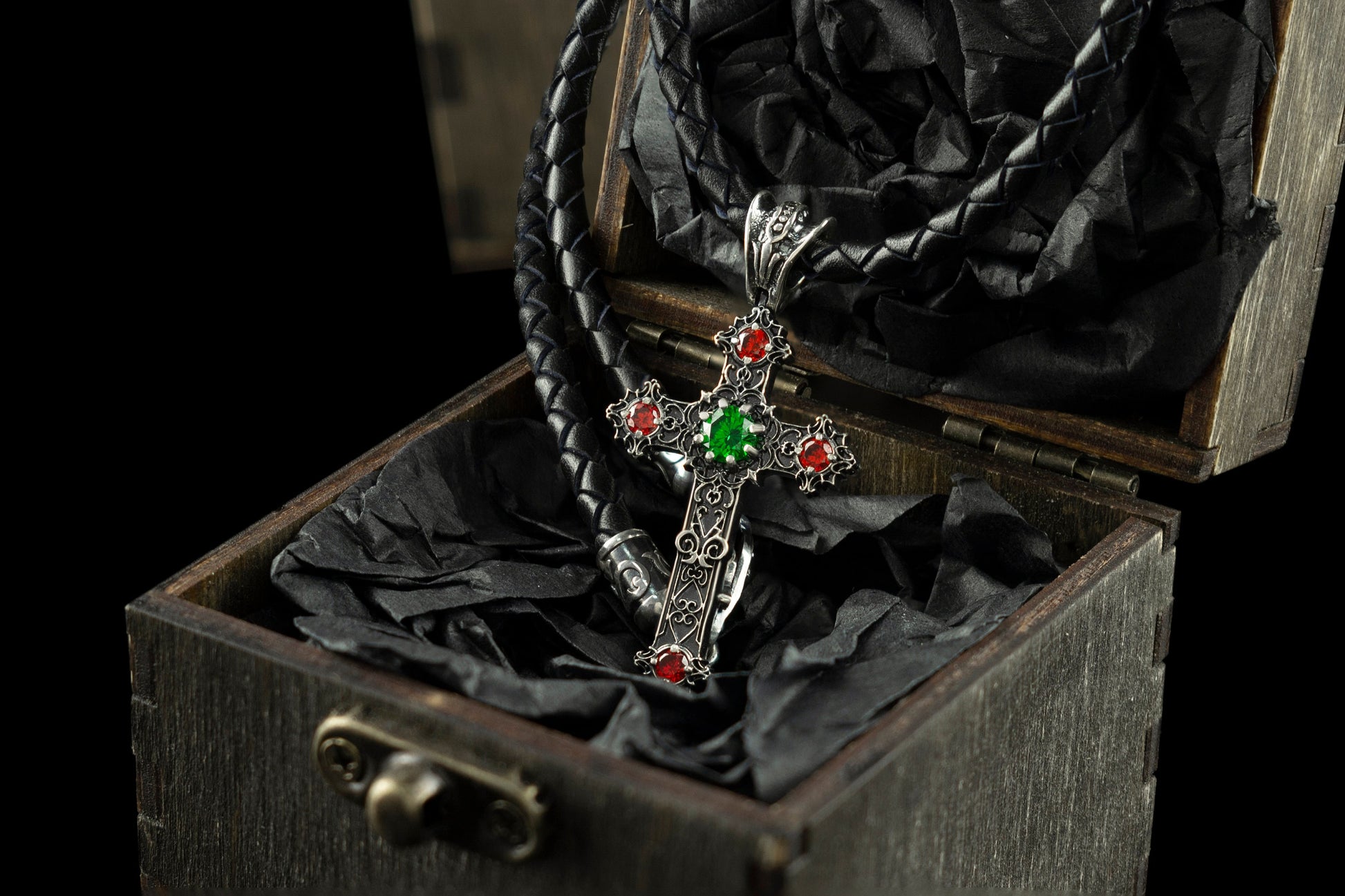 Gothic сross Silver cross necklace Cross with leather cord Green and red