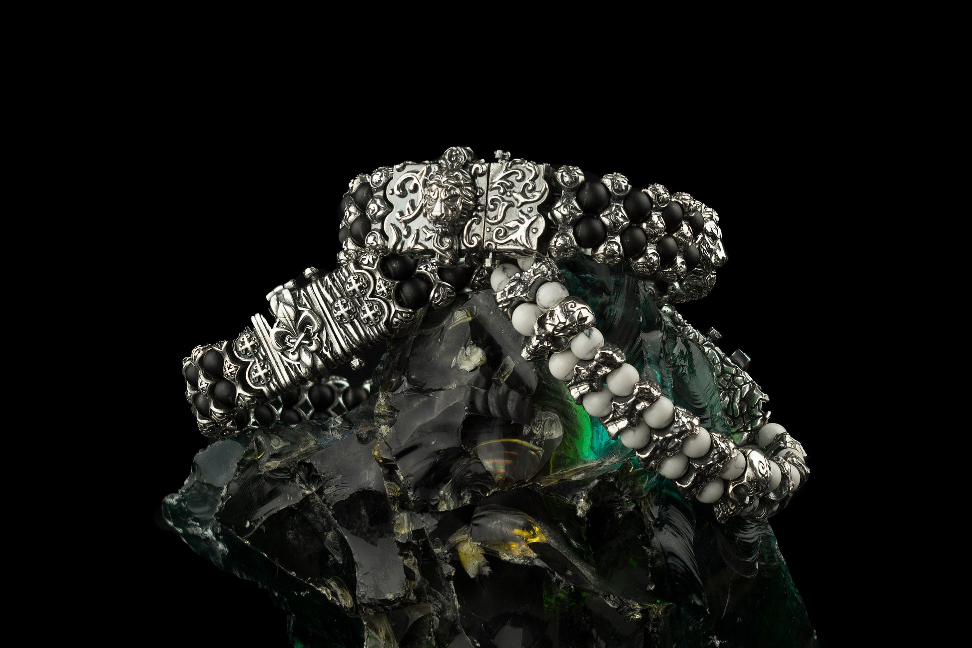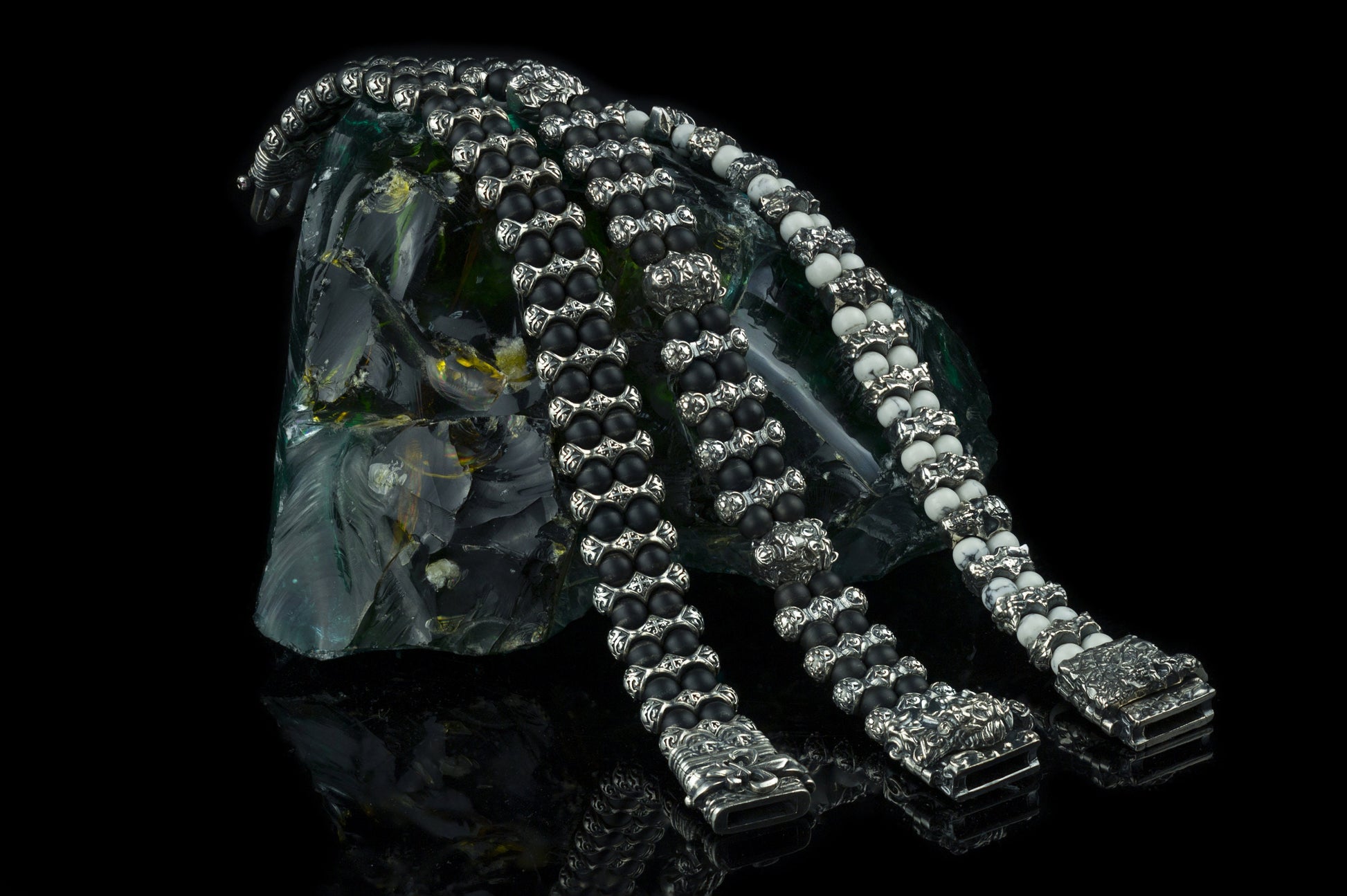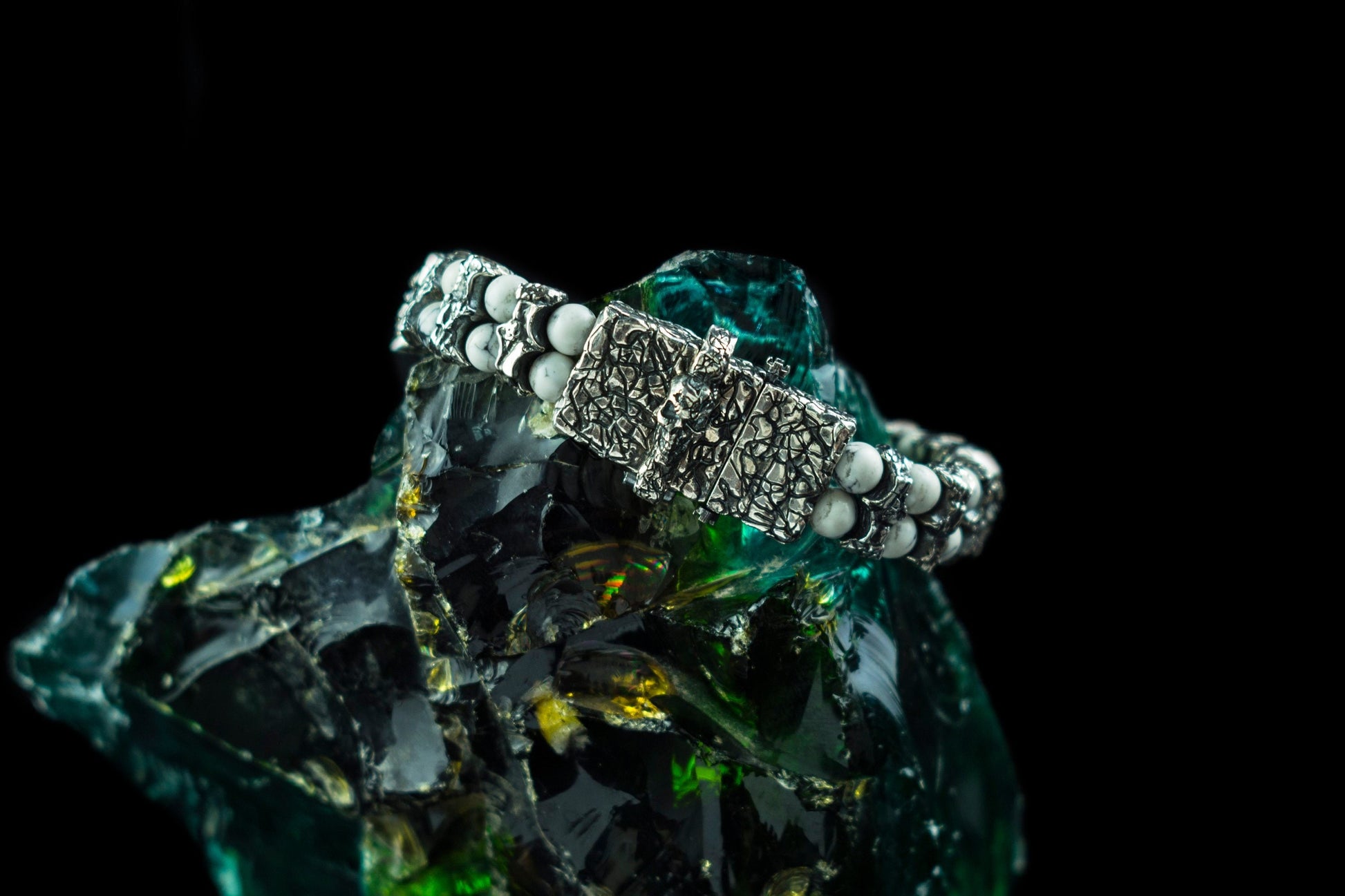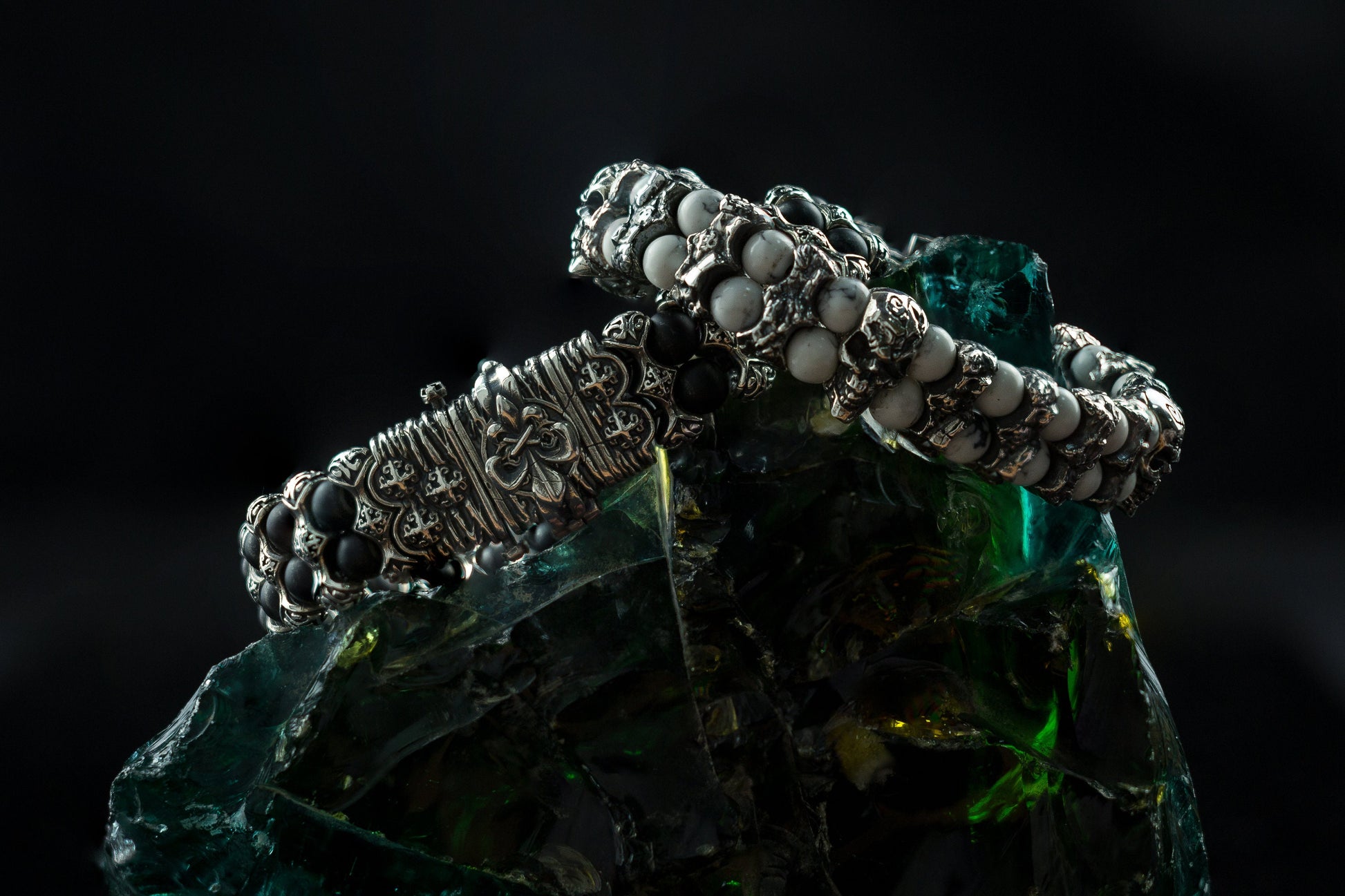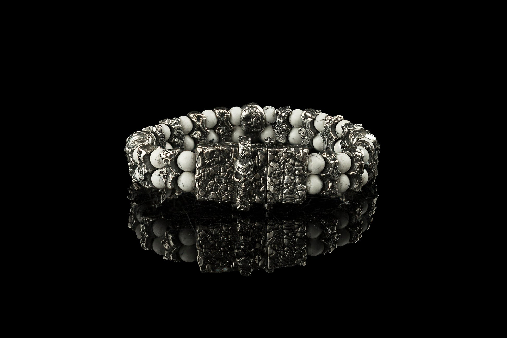 Men beaded bracelet, Whote beaded bracelet, Cacholong, Silver bracelet, Skull bead bracelet