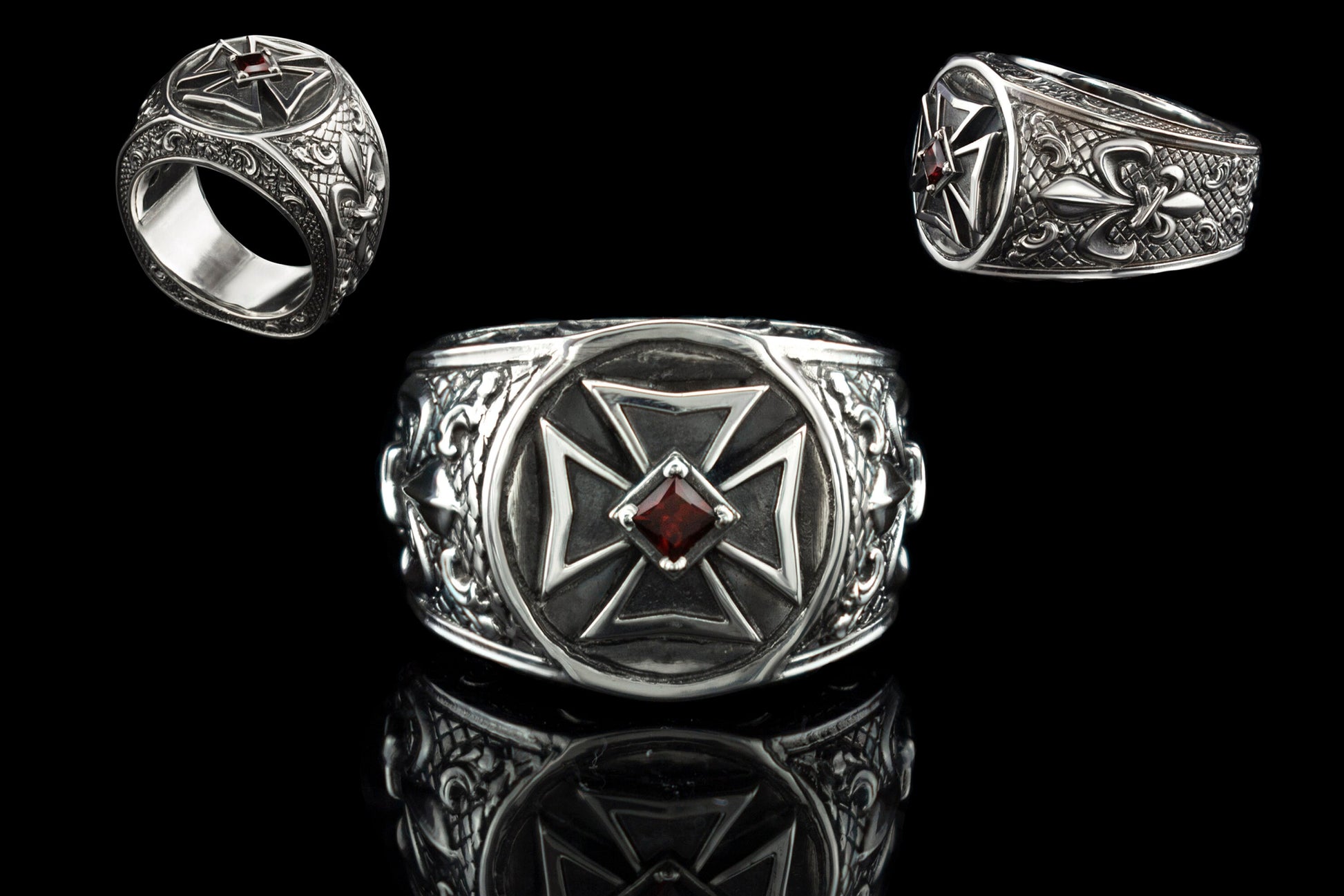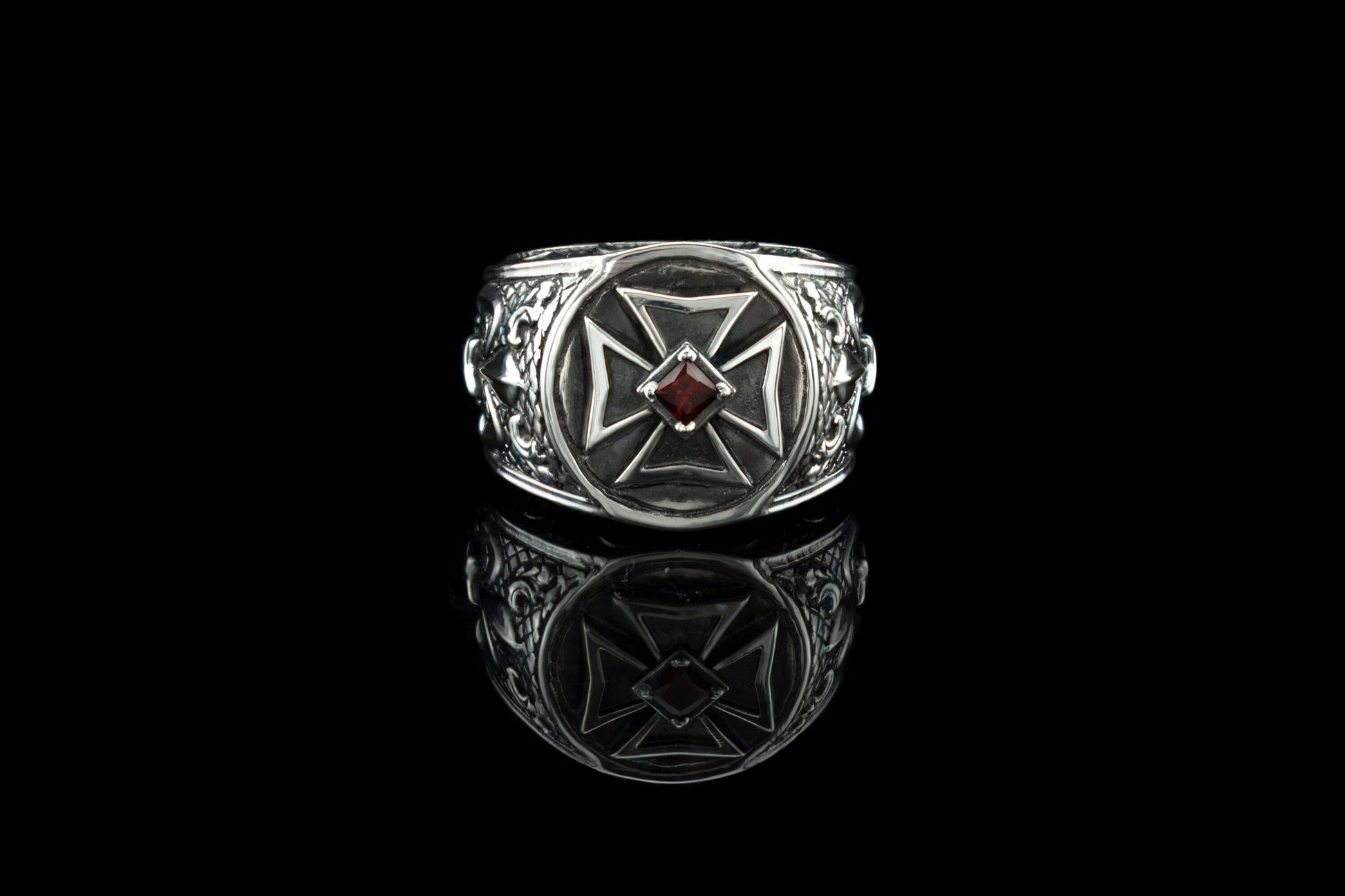 Silver garnet men ring 16 size Biker jewelry Maltese cross Signet ring Sterling silver Garnet ring Biker ring Iron cross