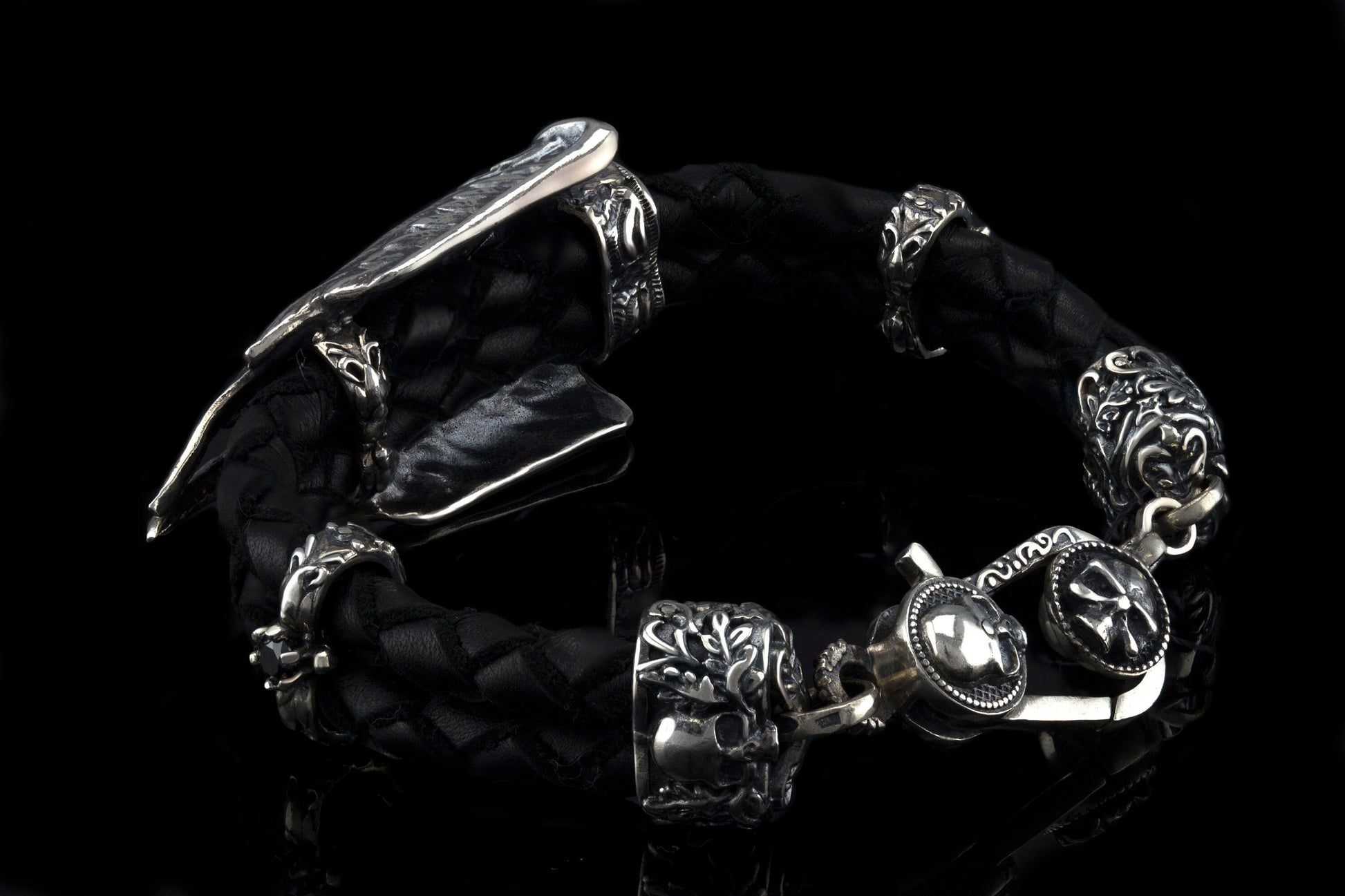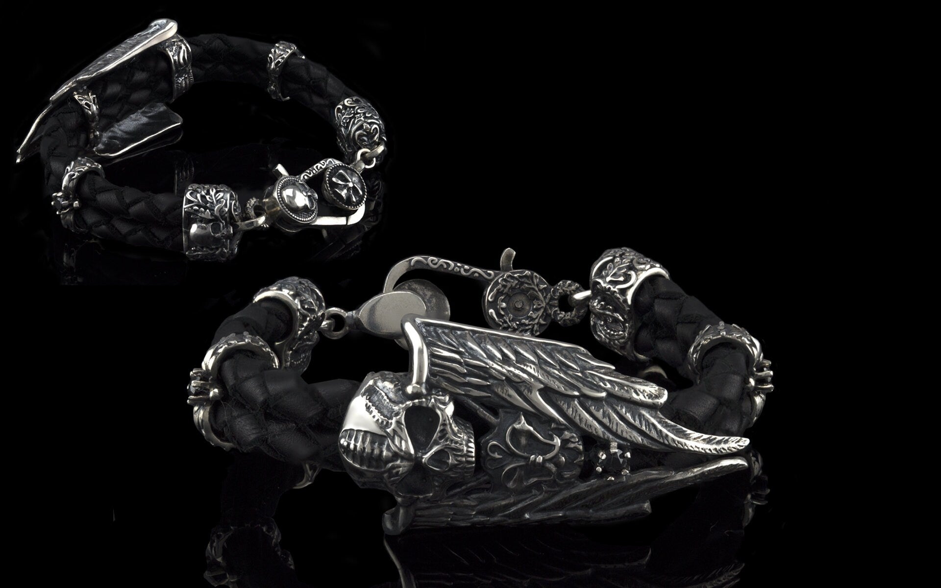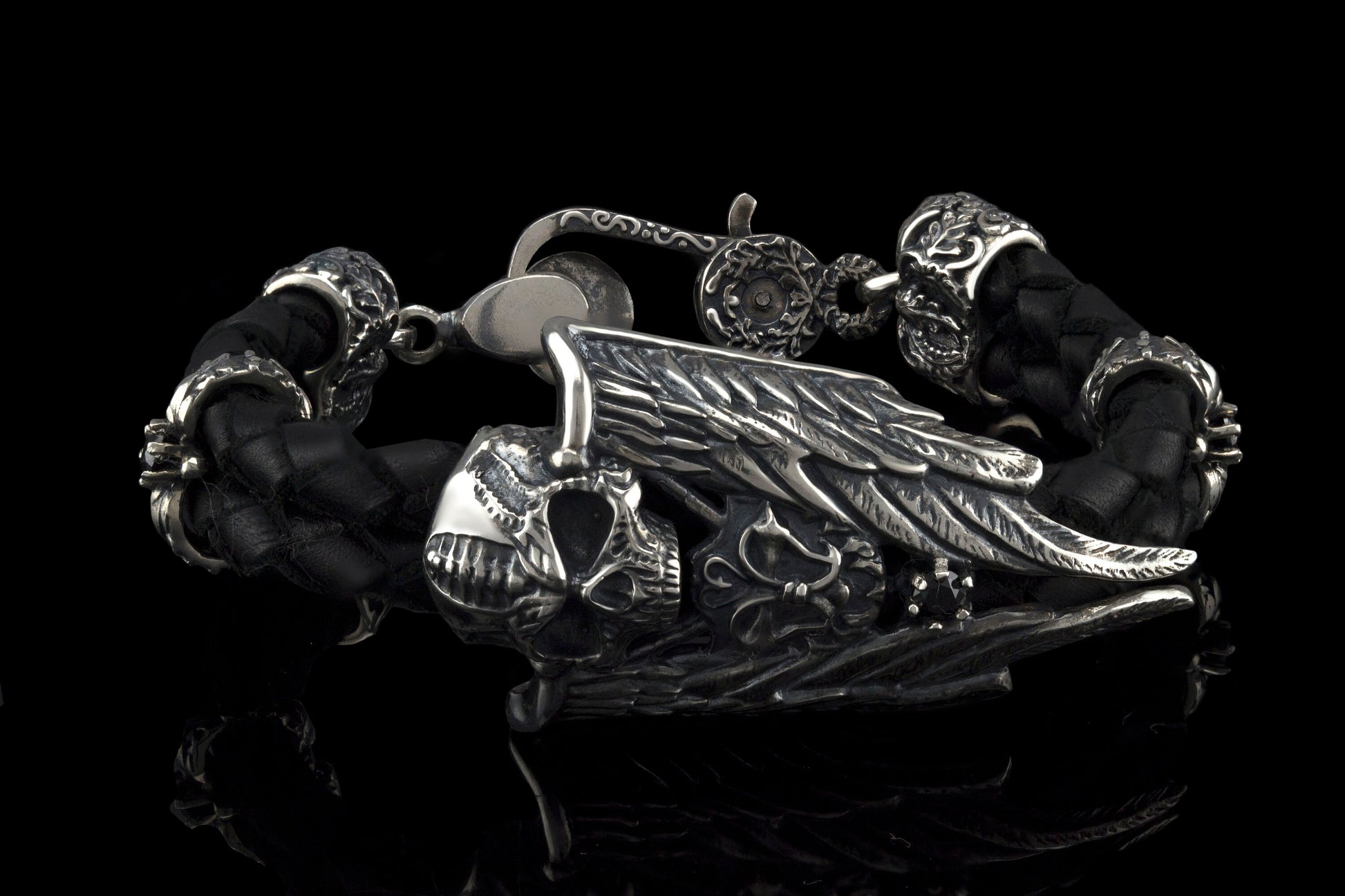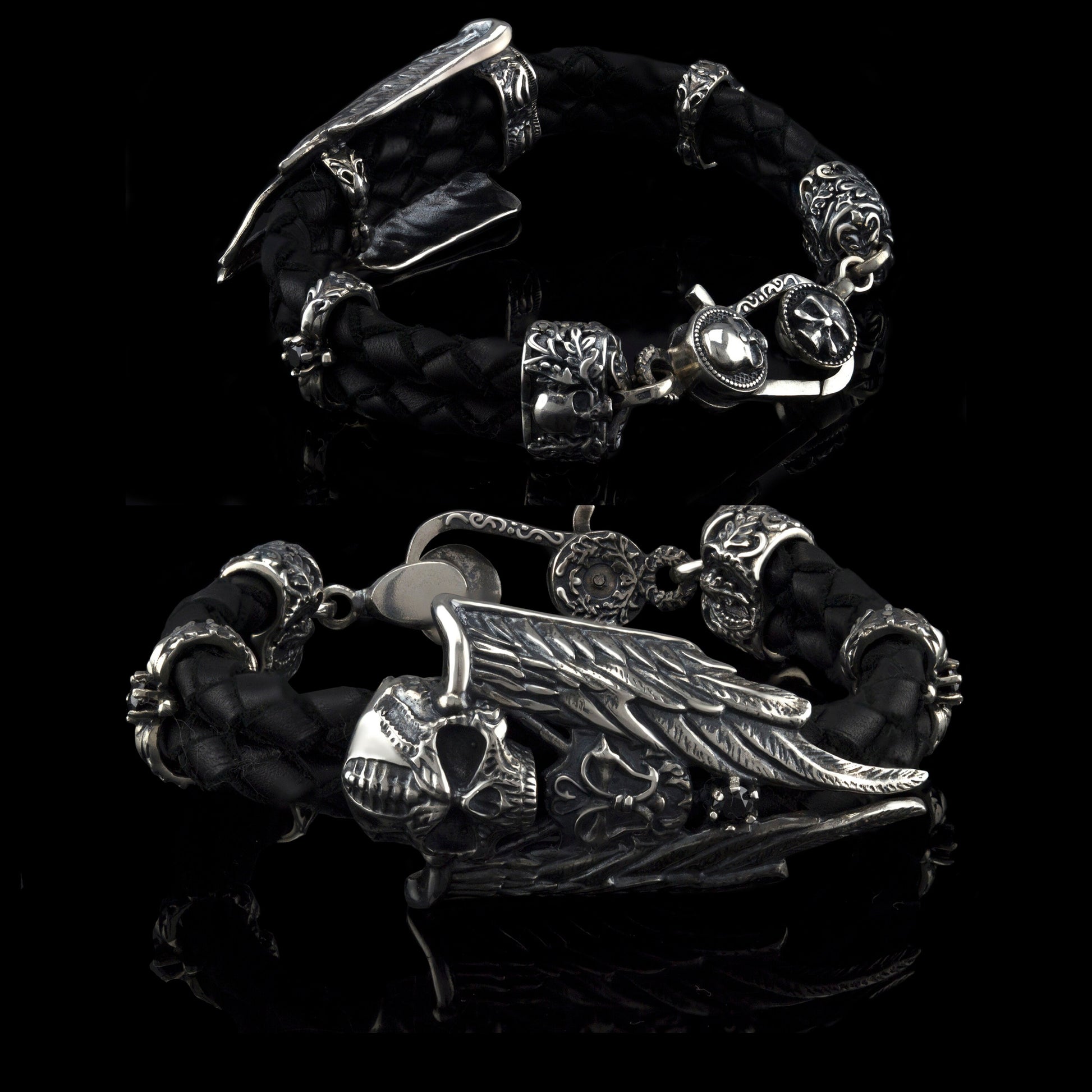 Skull bracelet Silver men's bracelet Leather bracelet Men's leather Skull leather bracelet Bikers jewelry Sterling silver jewelry Blade
