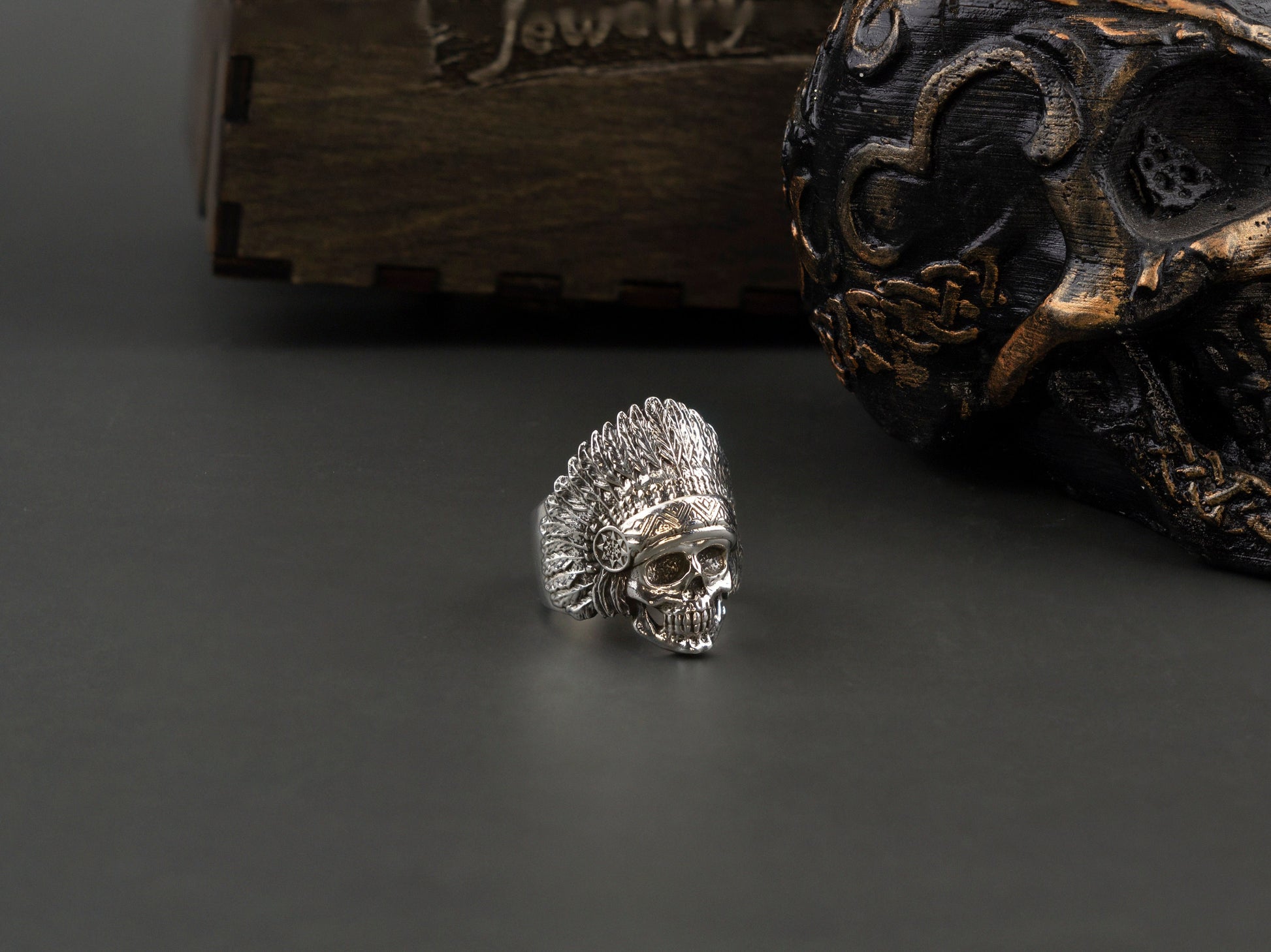 Skull Indian ring Silver skull Native American Ring with Indian roach headdress Biker jewelry