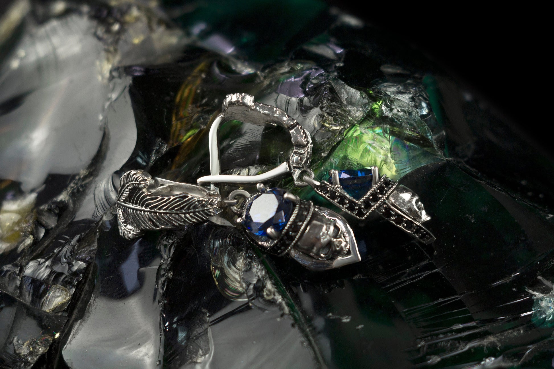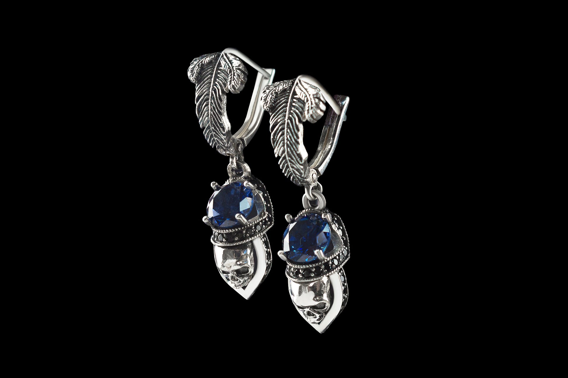 Women's skull earrings Silver skull earrings Skull gift for her Sapphire and black gems